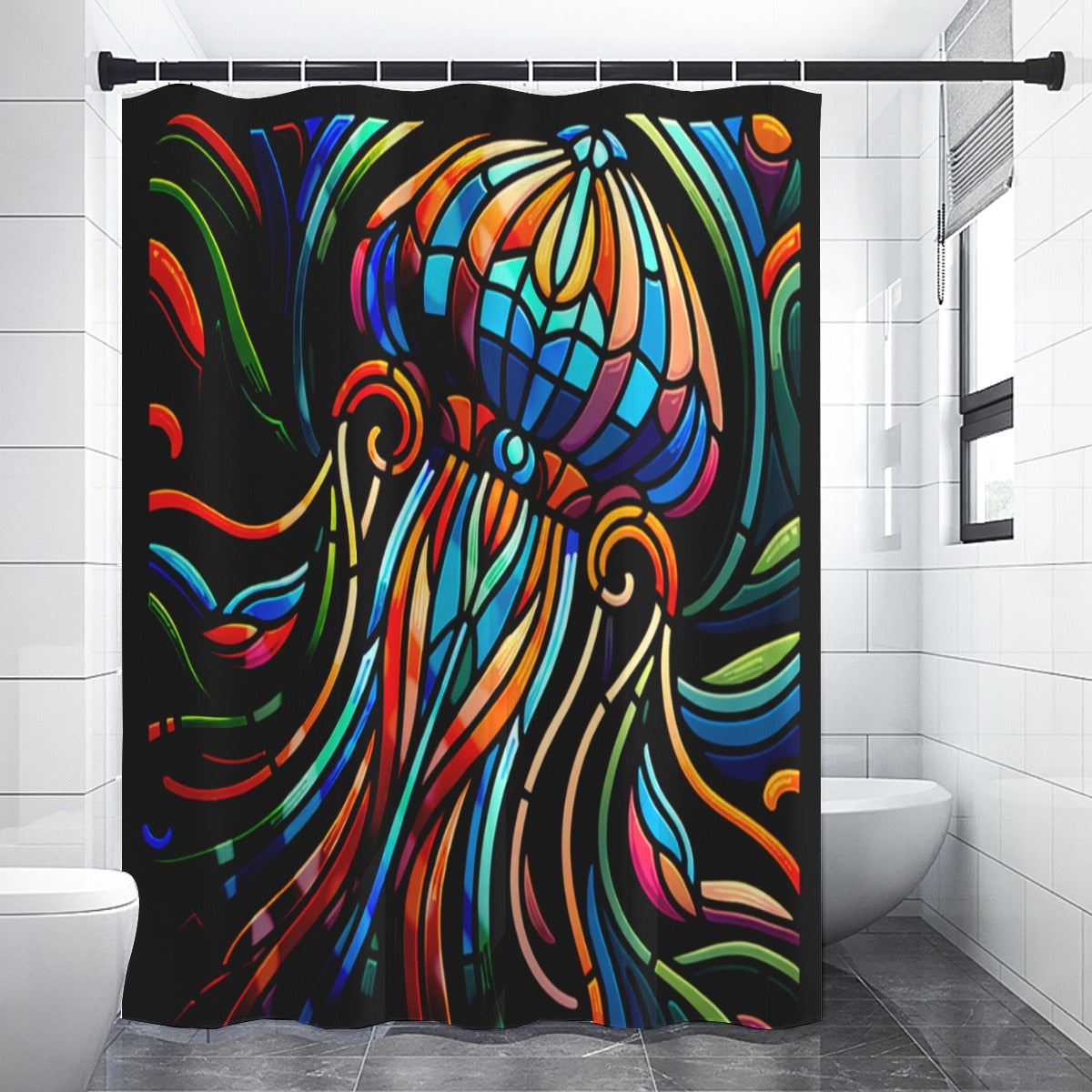Electrify your bathroom with this stained-glass jellyfish shower curtain set against a dramatic black background. Radiant ribbons of teal, coral, orange, and aqua flow like glowing glass, giving your space a bold Tiffany/Art Nouveau look. Printed in crisp HD on waterproof, machine-washable polyester, it’s a show-stopping upgrade for coastal, nautical, or modern bathrooms.